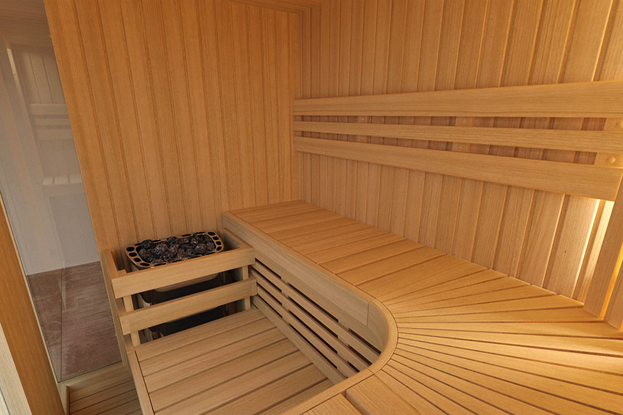 Una sauna sofisticata, l’ideale per l’ambiente domestico: le vetrate a parete permettono l’ingresso della luce pur mantenendo l’esperienza della sauna privata per chi si trova al suo interno.
